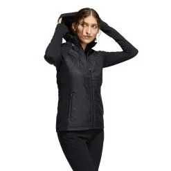 Keep your tee time even if it calls for cold weather with the Adidas Hybrid Quilted Womens Golf Jacket. Designed with a full zip closure and a drawcord-adjustable hood, this jacket is made to keep you warm and comfortable during your round. Thumbhole cuffs block out the cold and hold your sleeves in place while a quilted design on the chest adds a touch of style.