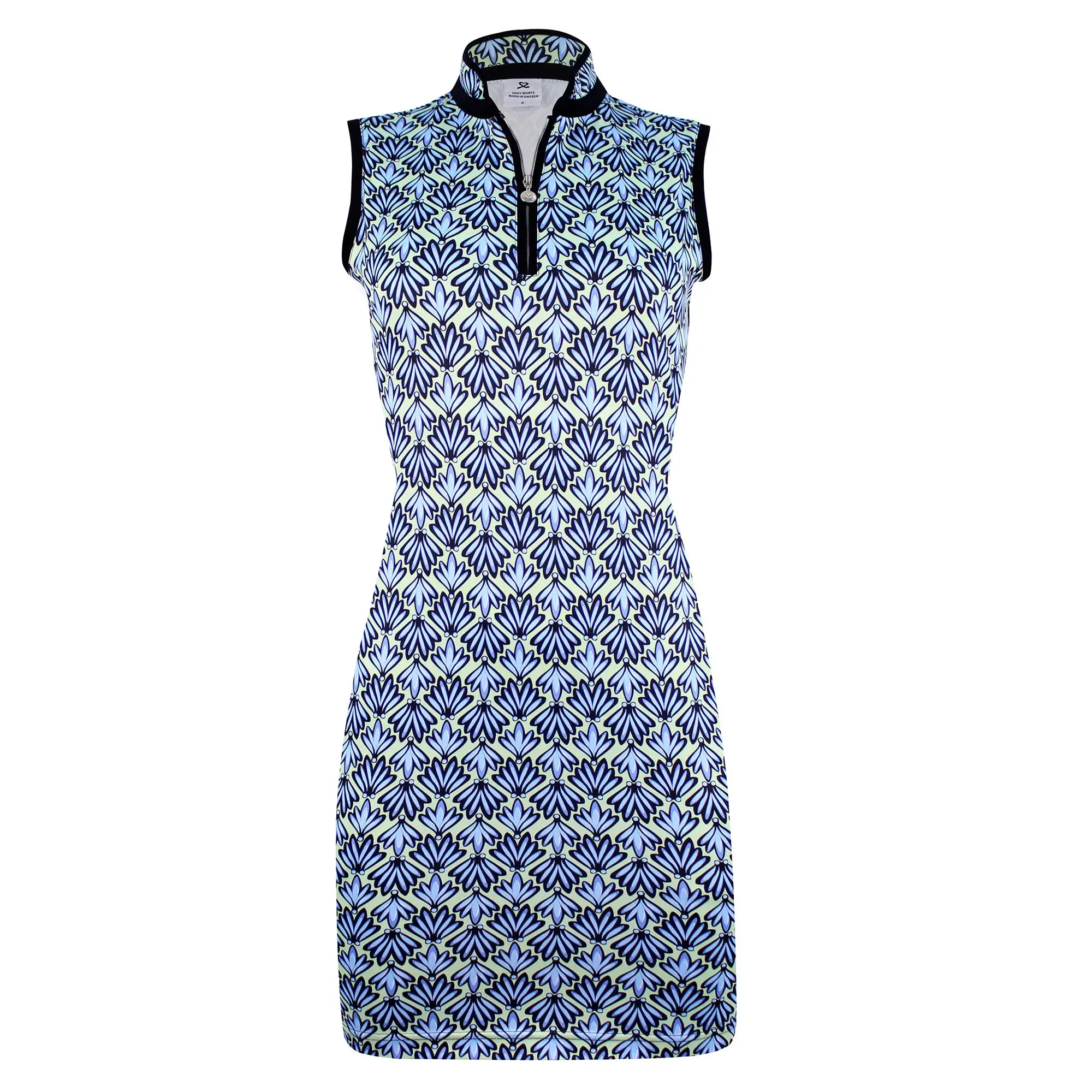Get style for your next round of golf with the Daily Sports Kiley Golf Dress. This sleeveless golf dress lets you show off your guns on hot summer days, and its built with a quick dry material that keeps you comfortable during your round. The short zip and contrasting leaf pattern and decorative banding around the arm holes, zip and collar add a touch of style. There are detachable inner shorts that provide added coverage during your backswing and as you pick your ball out of the hole.