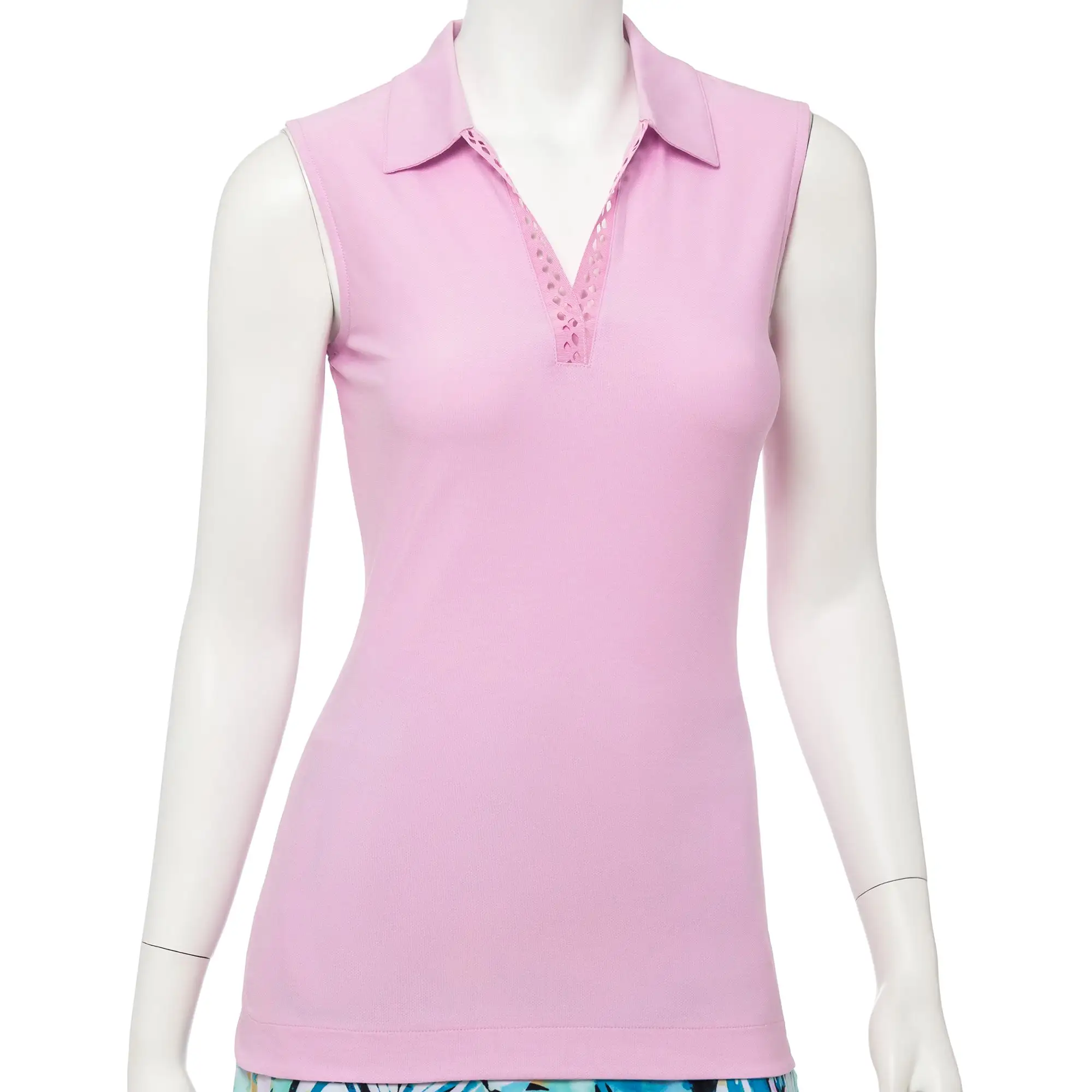 The EP NY Bora Bora Sleeveless Snakeskin Laser Trim Womens Golf Polo is sure to make you look feminine on the course. This sleeveless polo is offered in pink performance heather texture fabric, and features a laser cut snakeskin ribbon placket at the neck.
