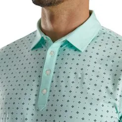 Take your golf style to the next level with the FootJoy Athletic Fit Deco Print Golf Polo. The Deco Print polo is built with the FootJoy Exclusive ProDry fabrication that will quickly wick away moisture to keep you dry and comfortable throughout the round and the Athletic Fit has shorter sleeves and a smaller chest for a fit, slimmer look. There is an anti-microbial technology that prevents odor from building up to keep you smelling fresh and the double stitched seams offer added durability and the extended back shirt tail make it easy to tuck in. The stylish deco pattern with a mint base color on this polo will have you looking good both on and off the golf course.