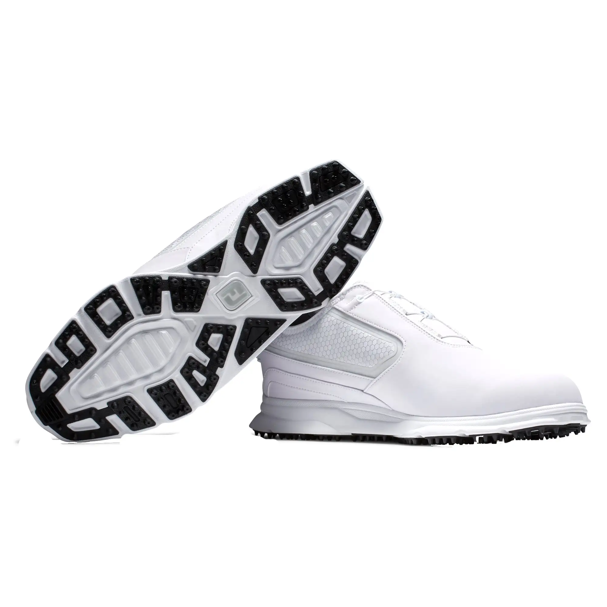 Perfect for summer rounds on the golf course comes the FootJoy Superlites XP BOA Golf Shoes. These shoes are light, flexible and provide 100 percent waterproof protection from morning dew to rain thanks to the performance synthetic leather upper that keep your feet dry and comfortable. The BOA fit system on the Superlites allow golfers to dial in that just right fit. The molded high-density EVA FitBed works with a FTF foam to enhance the comfort of this shoe to provide maximum walkability in every round. The Infinity outsole on the Superlites make this the most stable spikeless shoe FootJoy has made and offers golfers the perfect grip and ground contact. The full rounded toe character with its standard fit across the forefoot and instep provide added cushioning.