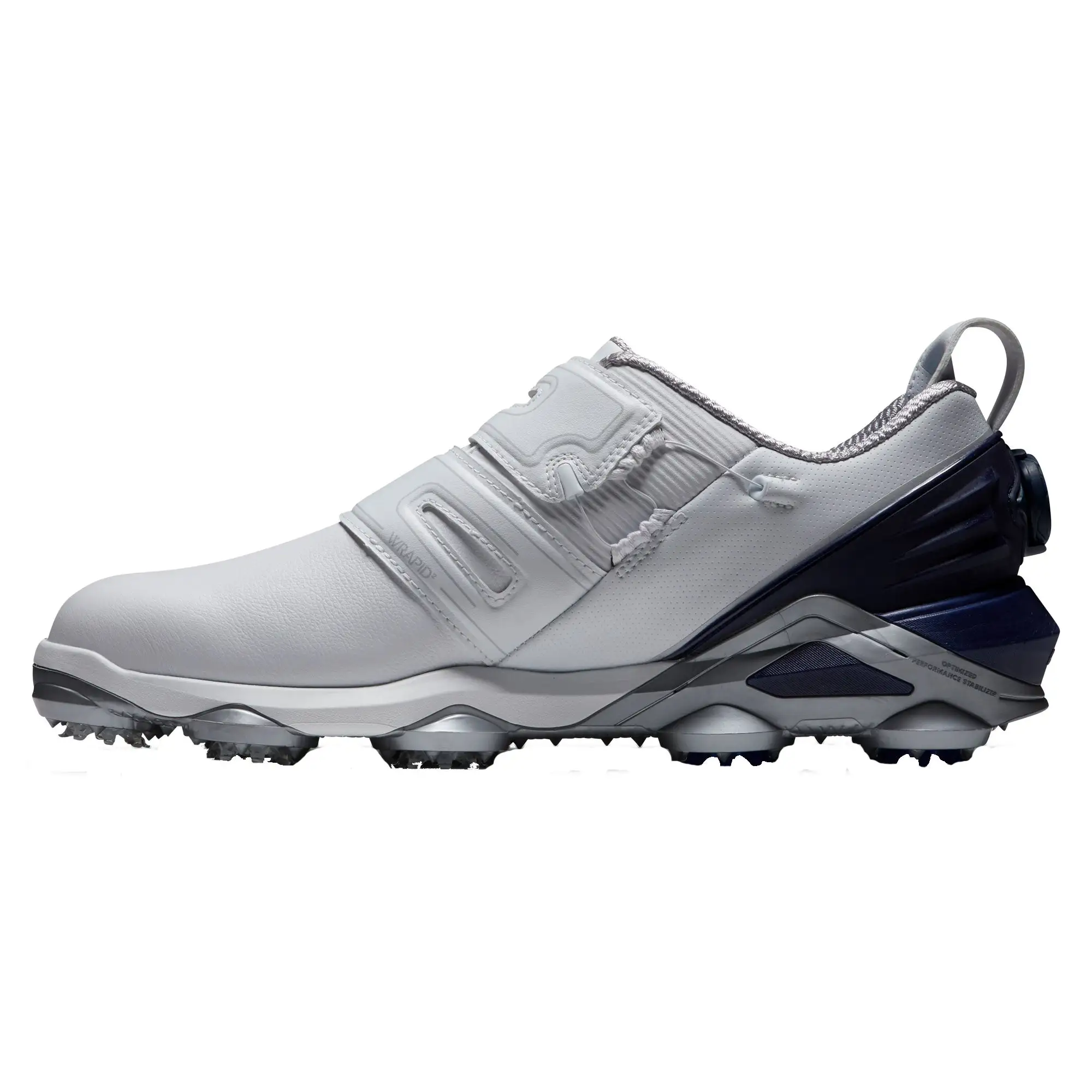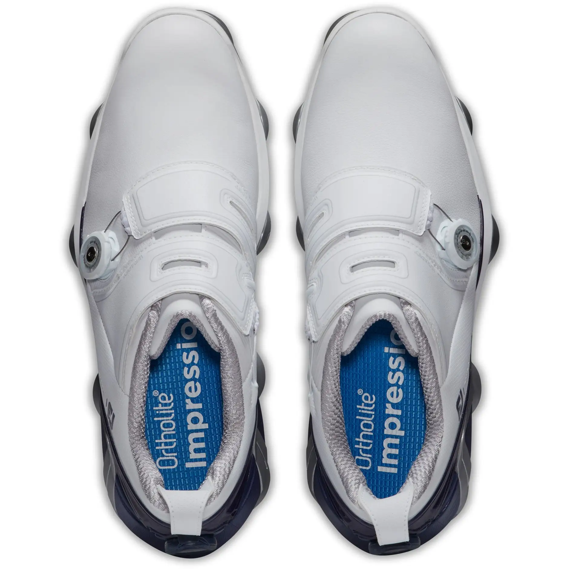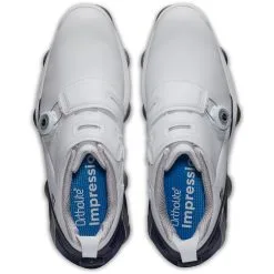 Get power reimagined with the FootJoy Tour Alpha Dual BOA Golf Shoes. These shoes provide 100 percent waterproof protection thanks to the Pittards ChromoSkin leather upper that keep your feet dry and comfortable. The Ortholite Impressions FitBed works with a dual-durometer FTF foam that enhanced the comfort of this shoe to provide maximum walkability in every round. The cleats on the Tour Alpha utilize the Fast Twist 3.0 system so golfers can change them when needed and they come out of the box with Pulsar low profile cleats by Softspikes that provide tour-level traction in all-weather conditions. The full rounded toe character with its standard fit across the forefoot and instep for added cushioning. The Dual BOA Fit system allows you to dial in fast for a performance fit with tons of comfort.