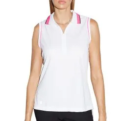 The GGBlue Kathy Womens Sleeveless Golf Polo is made to keep you cool and confident during your round. This top features a polo collar, 1/4 zip placket, white piping down the back, contrast piping on sleeves, and a contrast collar with stripes. It is incorporated with UV protection, moisture wicking, and anti-microbial technologies to keep you looking and feeling your best.