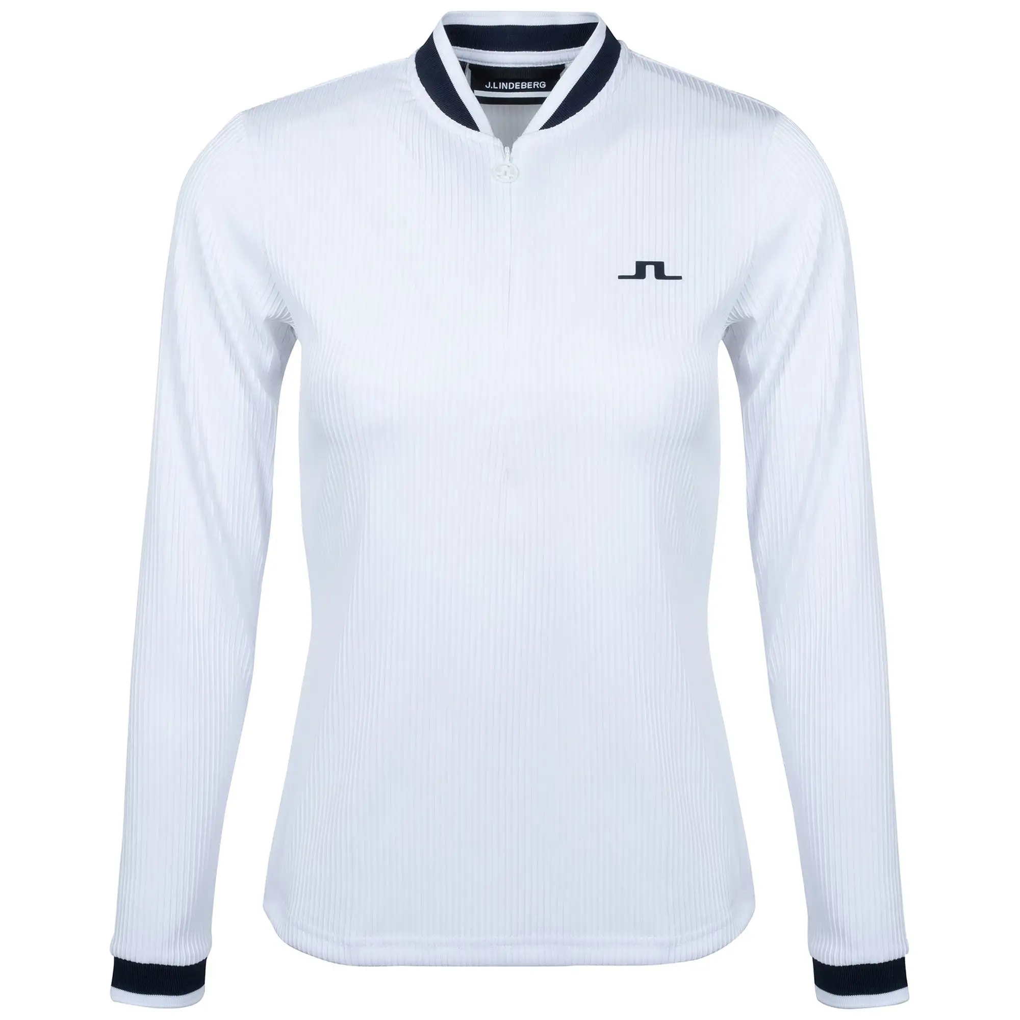 Layer up in style with the J. Lindeberg Leonor Mid Layer Womens Golf Pull Over. This pull over is made with a premium ribbed textured fabric to give you style and a firm stretch for all day comfort. It features a quarter zip placket, JL logo on the left chest, and contrast color at the collar and cuffs.