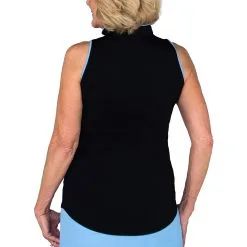 The Jofit Cutaway Notch Collar Sleeveless Womens Top from the Baileys Collection is made from super silky, moisture-wicking melange fabric, and features a stylish cutaway notch collar piped in ice blue. This sleeveless polo has cutaway styling to show off your shoulders, back darts for a feminine fit, and a scoop hem for extra coverage.