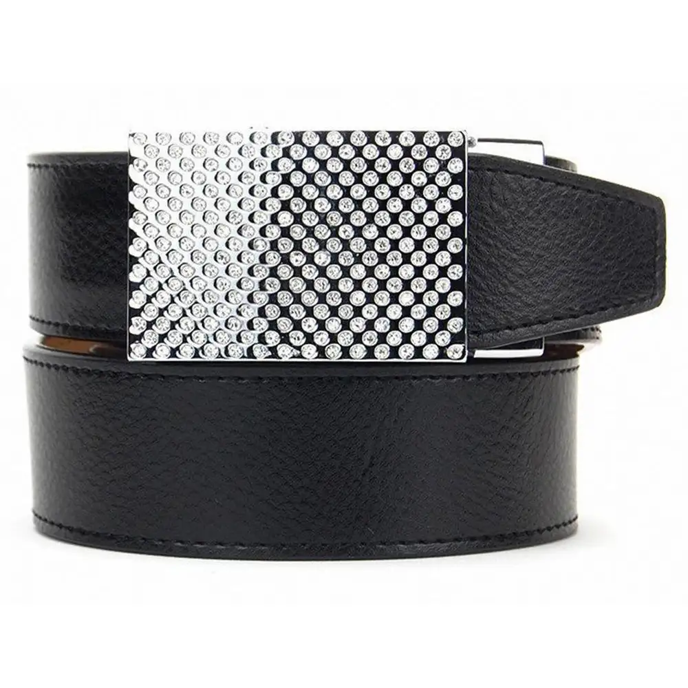 Stand out on the golf course with the Nexbelt Black Gem Series Belt. This belt features are Brilliant Chrome buckle with in-laid Rhinestone gems that will add style and flair to your golf wardrobe. The buckle face flips open to reveal a hidden petite Rhinestone ball marker.