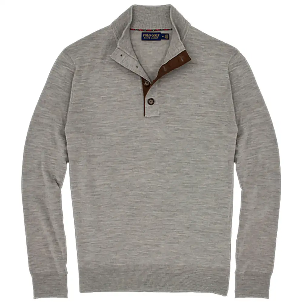 Get tons of style for colder rounds with the Polo Merino Wool Button Mockneck Golf Sweater. This sweater comes in a bold, eye-catching style and made with the soft and luxurious merino wool that will fit comfortably on the body. There is a button down placket with a contrast panel making this sweater even more dynamic.