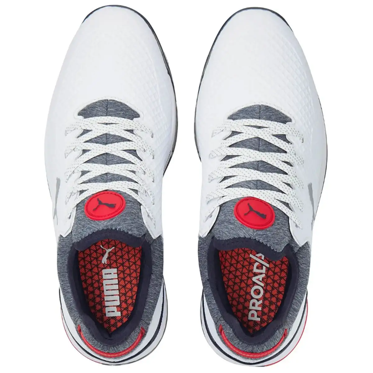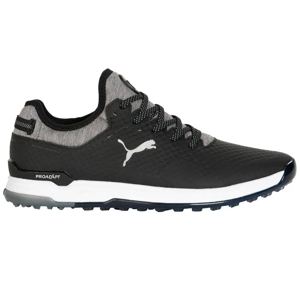 Up your game with the Puma ProAdapt AlphaCat Mens Golf Shoes. These shoes are made with Puma’s proprietary adapt foam which is made from a combination of EVA cushioning and an impact resistant polymer. The combination of the materials creates a platform that provides impact resistance, energy return, and ground feel. An exo-shell upper with thin film offers structure while waterproof material keeps your feet dry and comfortable. The ProAdapt multi-material outsole has a center crystal rubber zone for exceptional ground gripping traction and soft feel on hard surfaces.