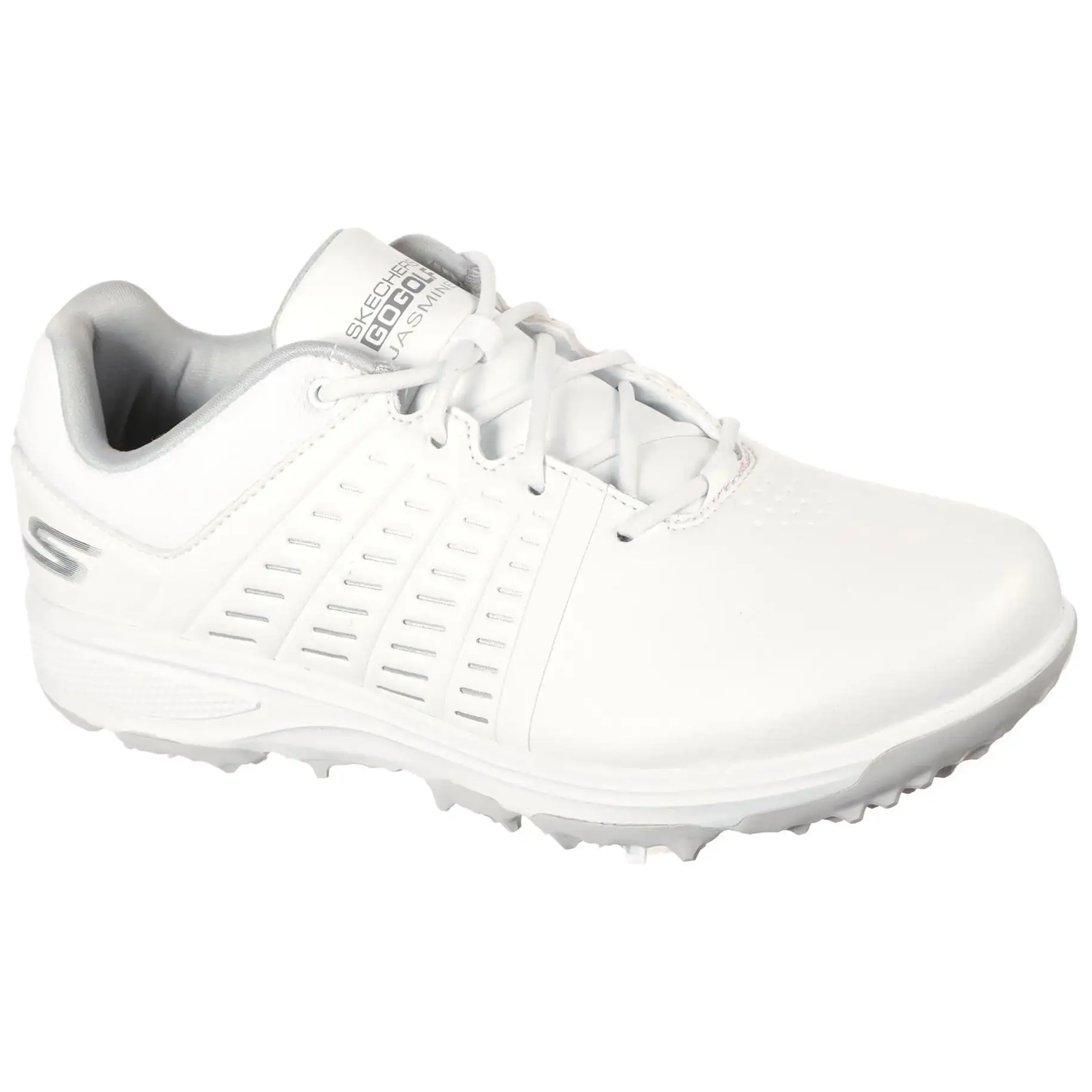 Play your best in the Skechers GO GOLF Jasmine Golf Shoes. The Jasmine shoes are built with a lightweight, responsive ULTRA GO foam cushioning and Goga Max technology and high-rebound insole that will provide tons of comfort. The synthetic leather upper is waterproof to keep feet dry when wet weather rolls in and the replaceable Softspikes with the Stealth PIN system provide secure grip and traction on all surfaces.