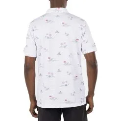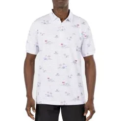 Show off your Patriotic side with the TravisMathew Lake Break Golf Polo. The Lake Break is built with a polyester/cotton/spandex blend with an enhanced four-way stretch that provides supreme comfort throughout the golf swing. This polo is also moisture wicking to pull sweat from the body and keep you dry and comfortable throughout the round. There are built-in collar stays that ensure the collar maintains its shape for a stylish look. The Patriotic all-over print and TM logo on left chest will have you looking good on and off the golf course.